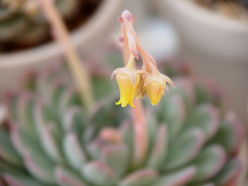 待ちに待ってようやく咲いた、エケべリア「花月夜」の花。 はじめは貧弱だと思っていた花茎も、しっかりと力強く伸びた。 黄色いベル状の花。 ベルの中の様子を撮りたかったけどピントが合わなくて断念。 寝っ転がったら撮れるかなー、後日チャレンジしてみ…